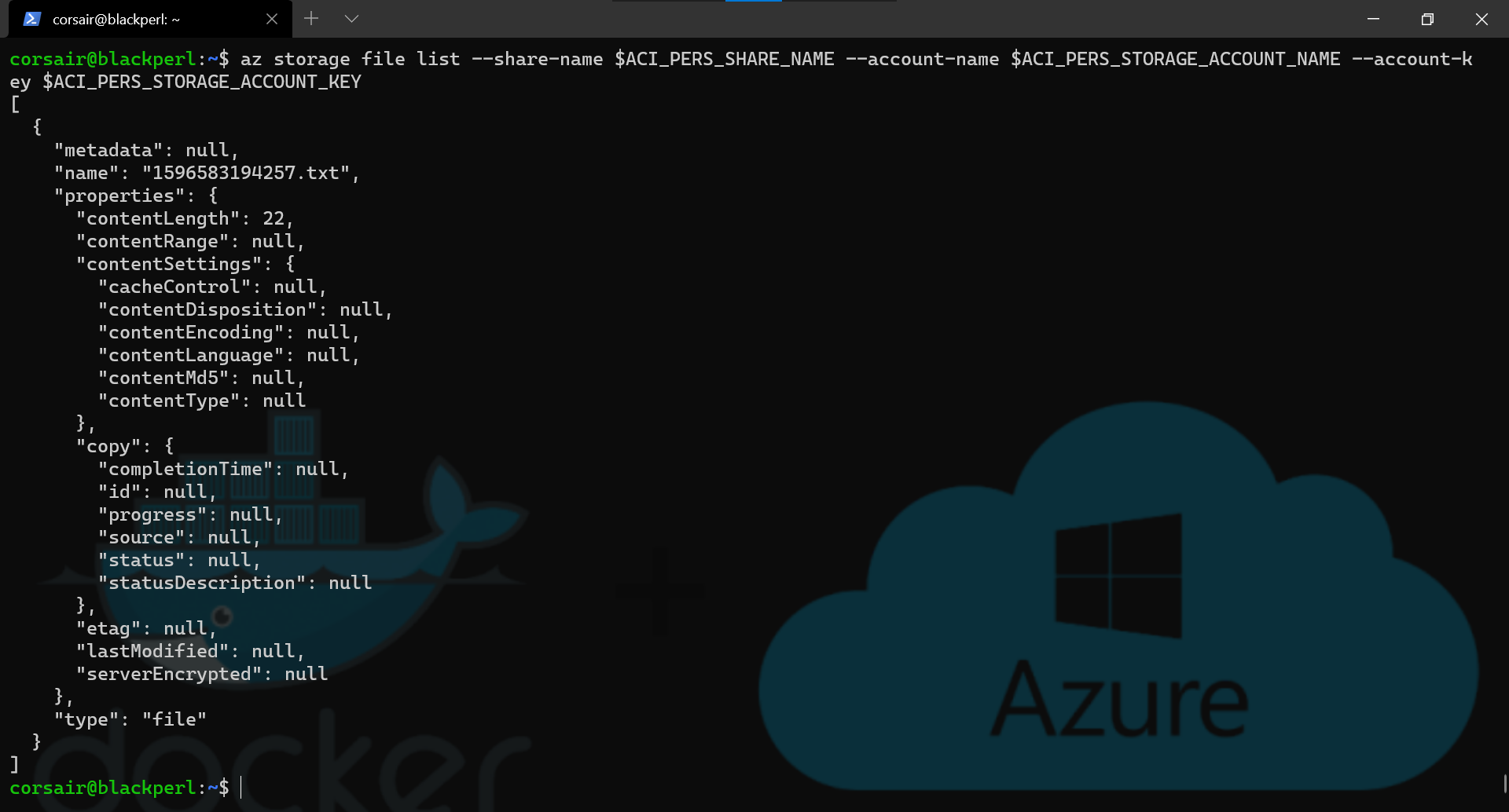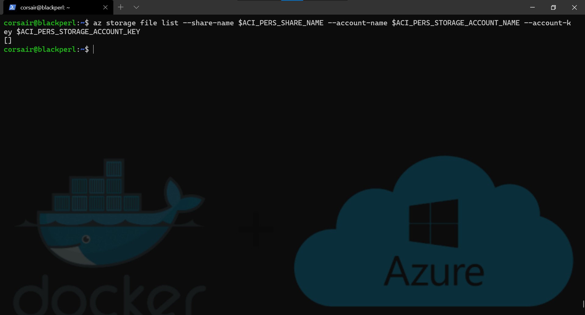az storage file list --share-name $ACI_PERS_SHARE_NAME --account-name $ACI_PERS_STORAGE_ACCOUNT_NAME --account-key $ACI_PERS_STORAGE_ACCOUNT_KEY