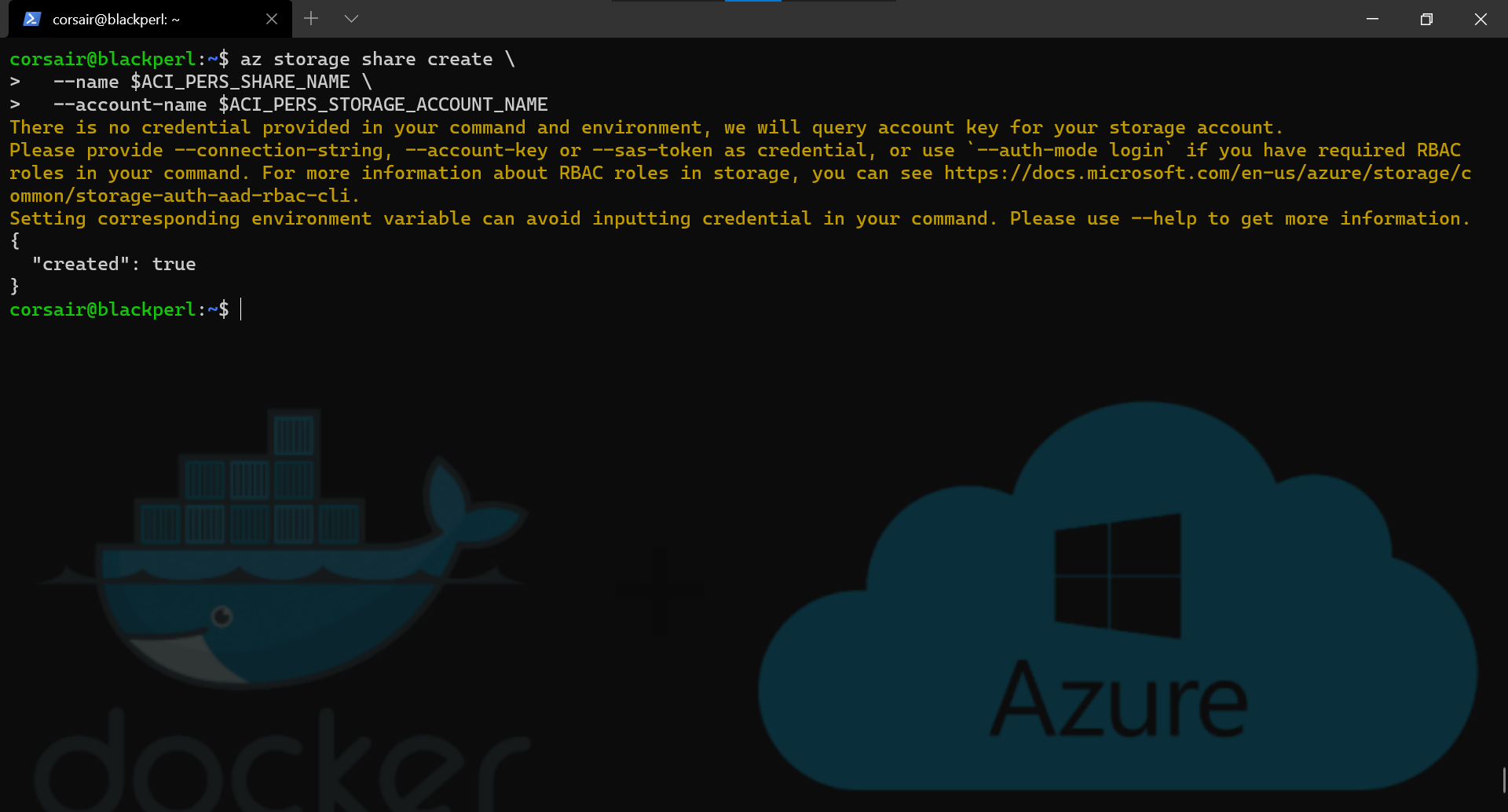 Before we deploy the container, we will need to create an Azure File share as explained in this excellent Azure blog post. This is needed as, for now at least, we cannot create a volume in Azure with Docker cli.