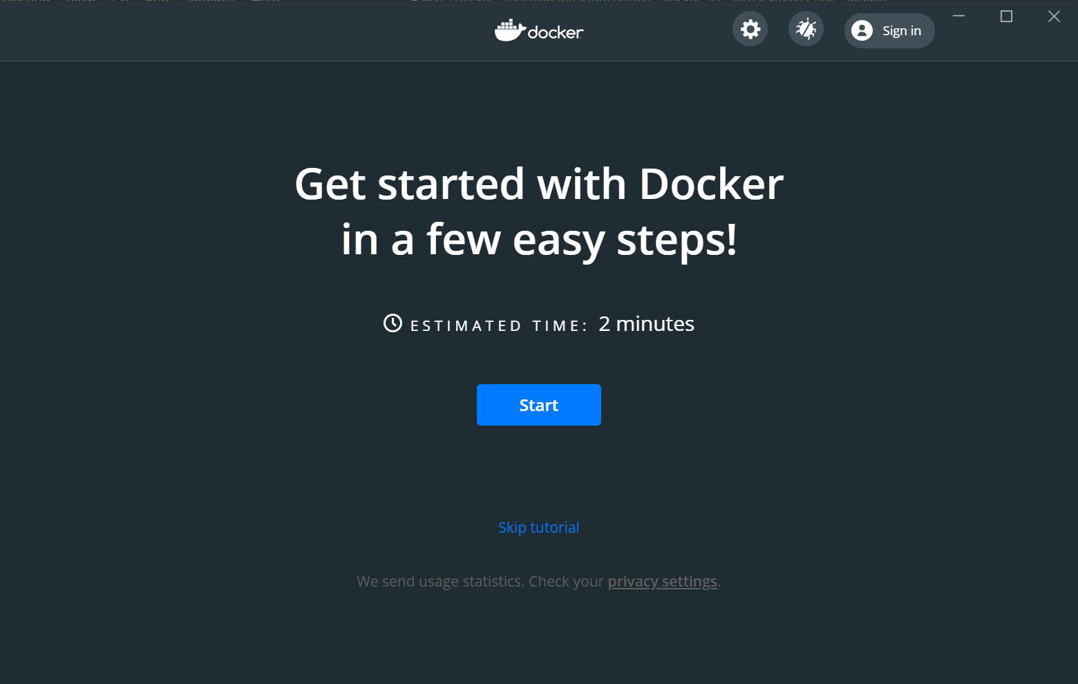We should now see the Docker Desktop window, meaning we successfully installed Docker Destkop: