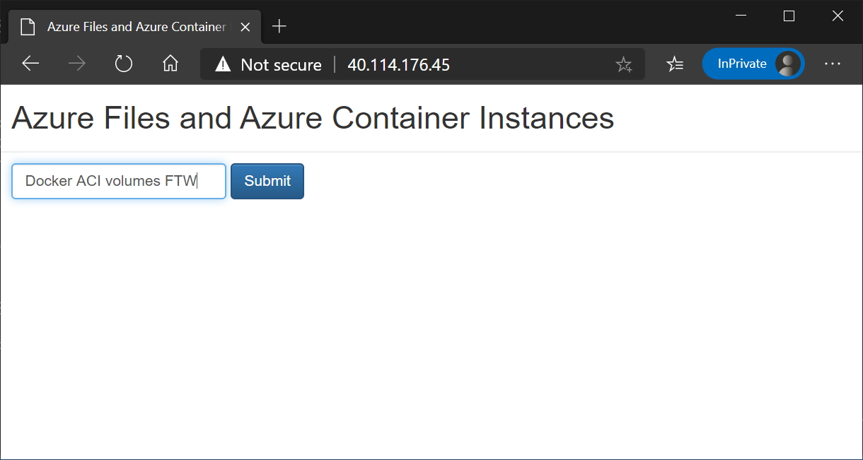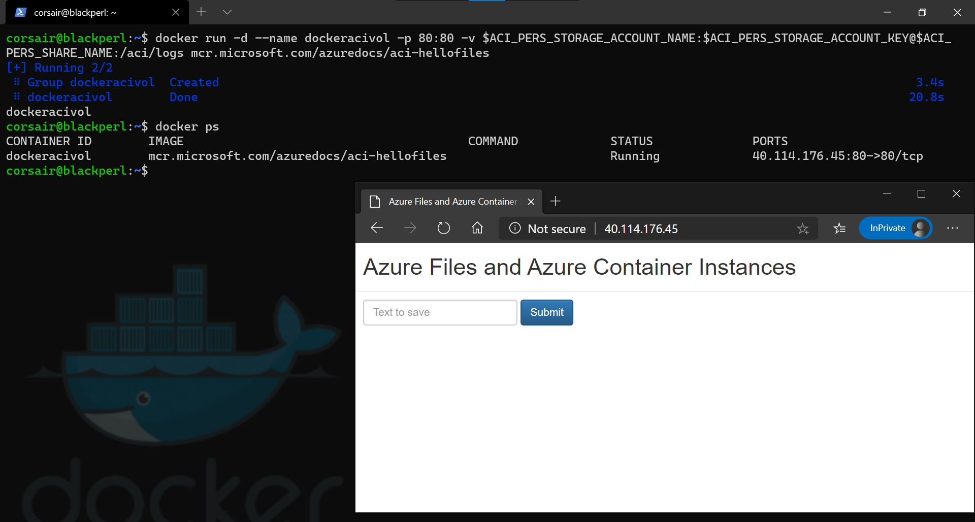 docker run -d --name dockeracivol -p 80:80 -v $ACI_PERS_STORAGE_ACCOUNT_NAME:$ACI_PERS_STORAGE_ACCOUNT_KEY@$ACI_PERS_SHARE_NAME:/aci/logs mcr.microsoft.com/azuredocs/aci-hellofiles